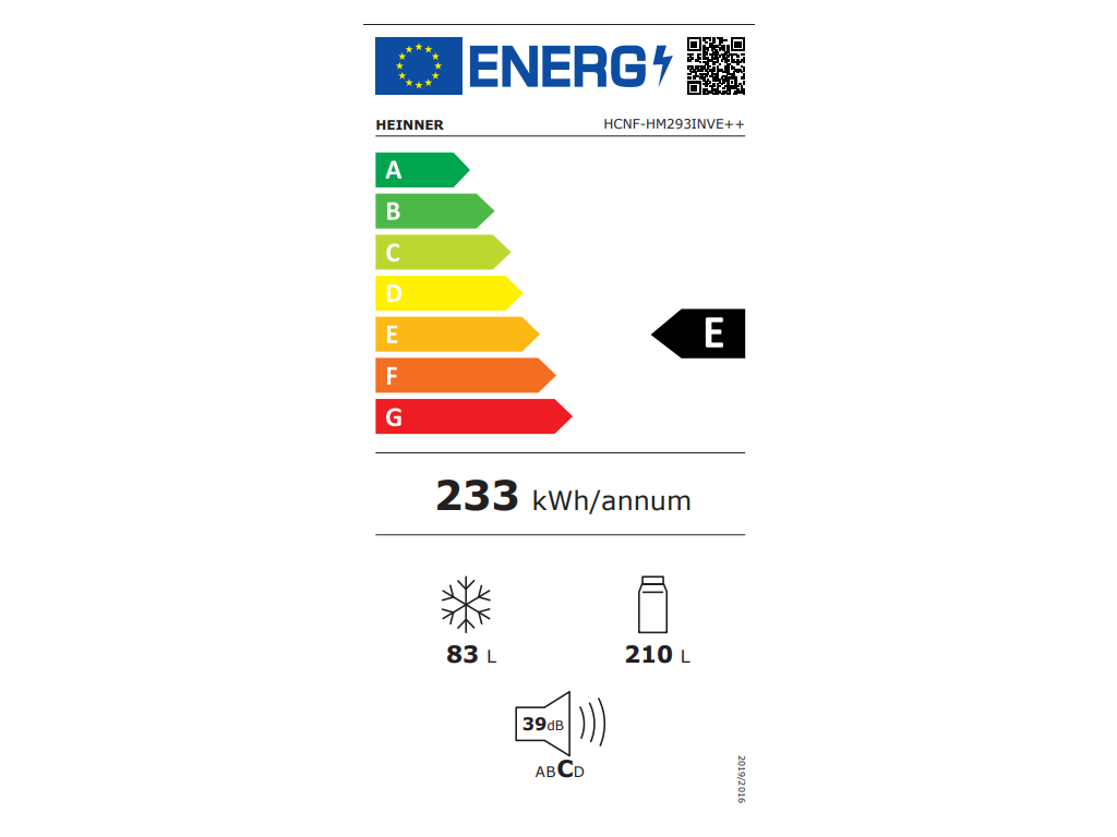 Čistý objem 293 l (210 l chladnička / 83 l mrazák). Energetická třída E, hlučnost 40 dB. Systém Multi Air Flow pro rovnoměrnou cirkulaci vzduchu, elektronické ovládání. Rozměry: 185,8 x 60 x 60,5 cm.