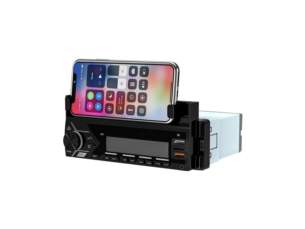 Součástí autorádia je praktický držák na chytrý telefon, který usnadňuje jeho uchycení a zároveň zvyšuje přehlednost ovládání během jízdy. RCA výstupy umožňují připojení k externím zesilovačům a vícekanálovým audio systémům vozidla, čímž výrazně zlepšují zvukový zážitek. Uživatelské rozhraní zahrnuje přehledný přední panel s tlačítky pro snadnou navigaci a možnost přizpůsobitelného sedmibarevného podsvícení, které doplní interiér vašeho vozu.