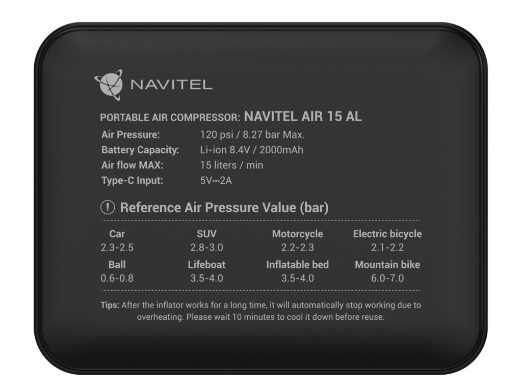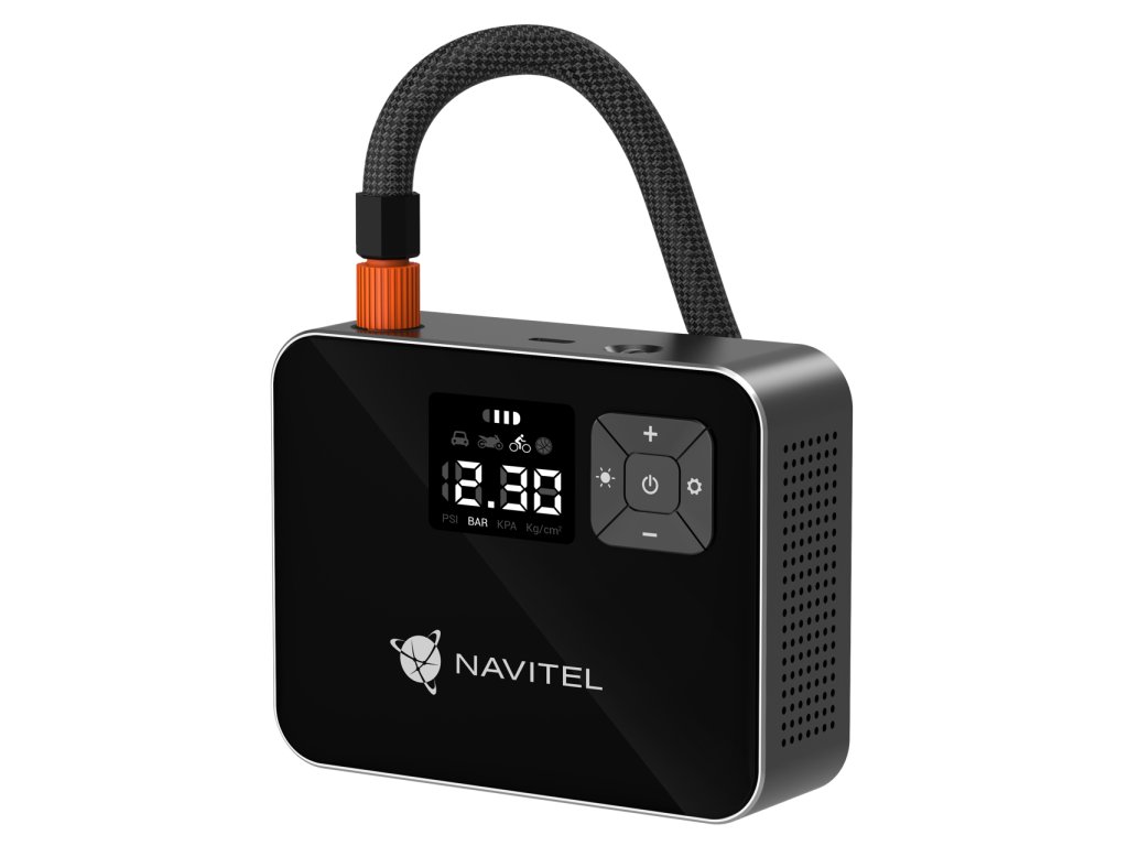 NAVITEL AIR 15 AL je stylový akumulátorový vzduchový kompresor s automatickým regulátorem tlaku, digitálním tlakoměrem a LCD displejem. AIR 15 AL umožňuje bez problémů nafouknout pneumatiky auta, kola, motocyklu, nafouknout míč nebo hračku na plavání. Díky vestavěné Li-ion baterii s kapacitou 2000 mAh funguje AIR 15 AL samostatně - bez připojení k elektrické zásuvce nebo palubní síti vozidla.