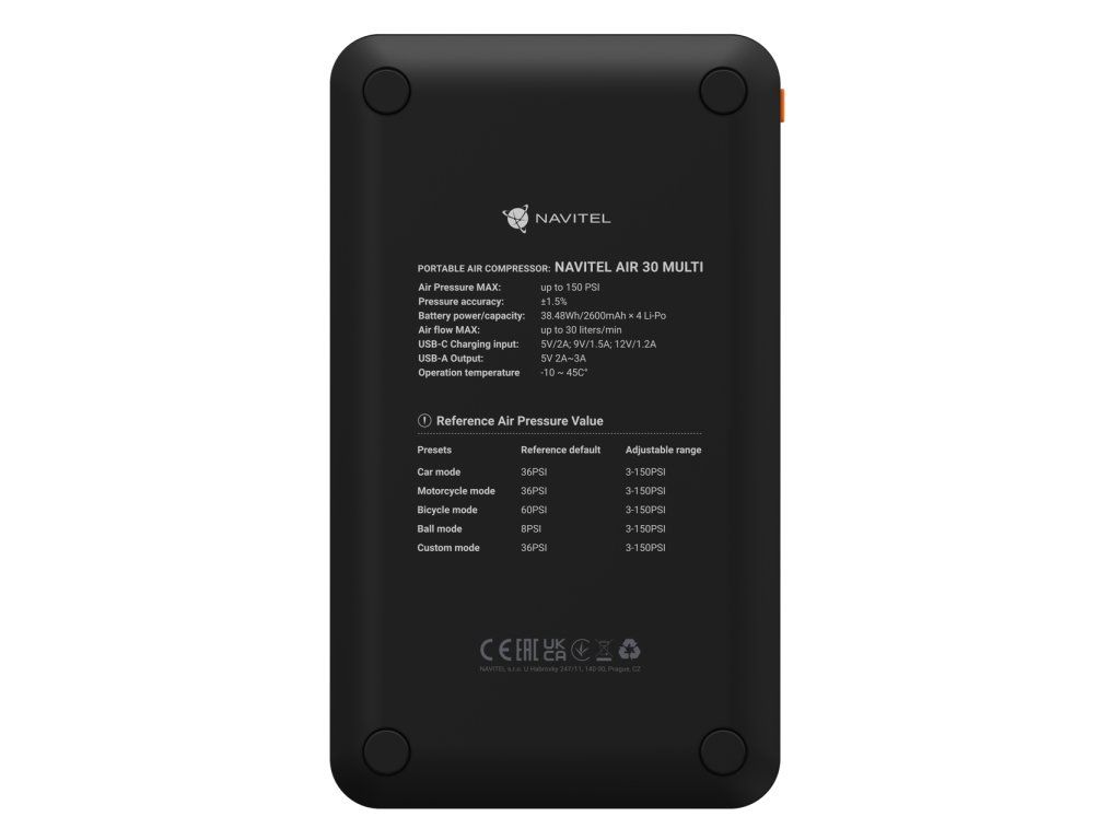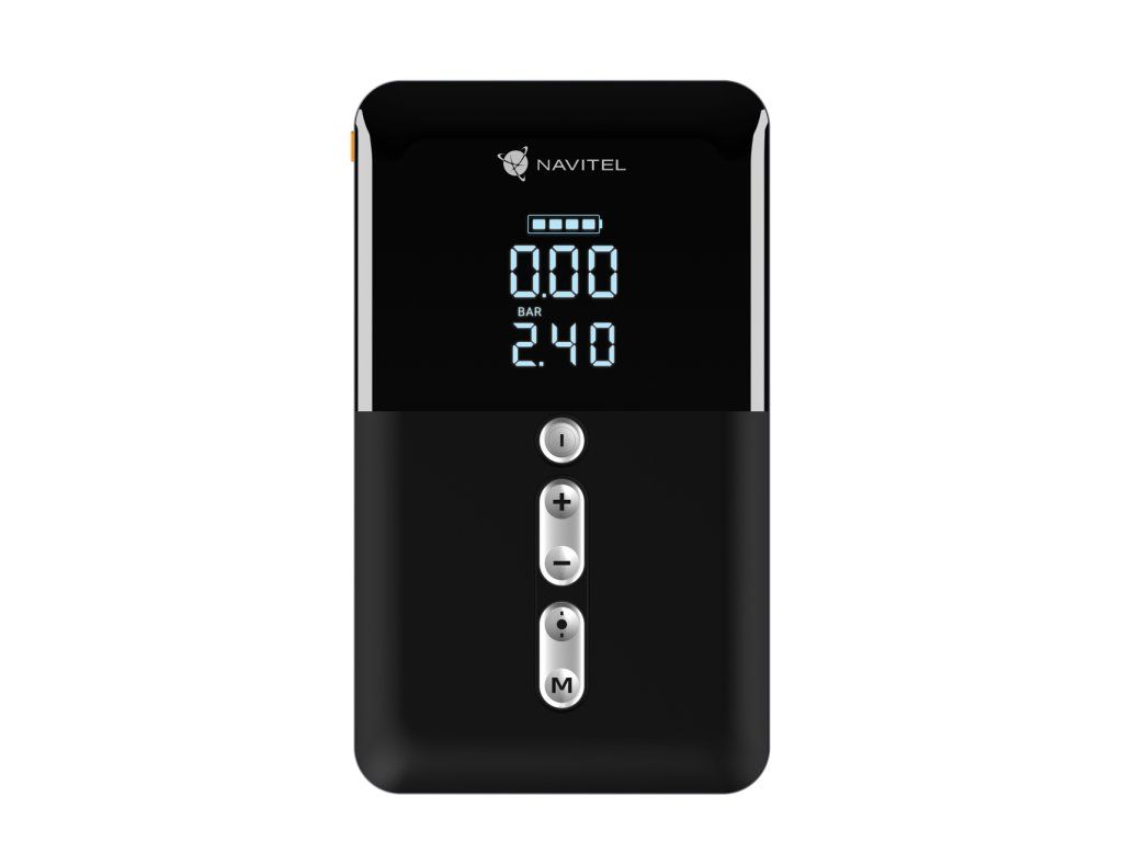 NAVITEL AIR 30 MULTI je vybaven LCD displejem, který zobrazuje aktuální tlak, jednotky měření a stav baterie. Nastavení, režimy a svítilna se ovládají sadou pěti tlačítek na předním panelu. Je také vybaven dvěma USB-A výstupy při 5V/2A, které umožňují nabíjet smartphony, tablety, sluchátka a další přenosná zařízení. Samotný kompresor je napájen 10000 mAh baterií nebo jej lze zapojit přímo do 12V autozásuvky přes USB-C kabel, pokud je jeho baterie vybitá.
