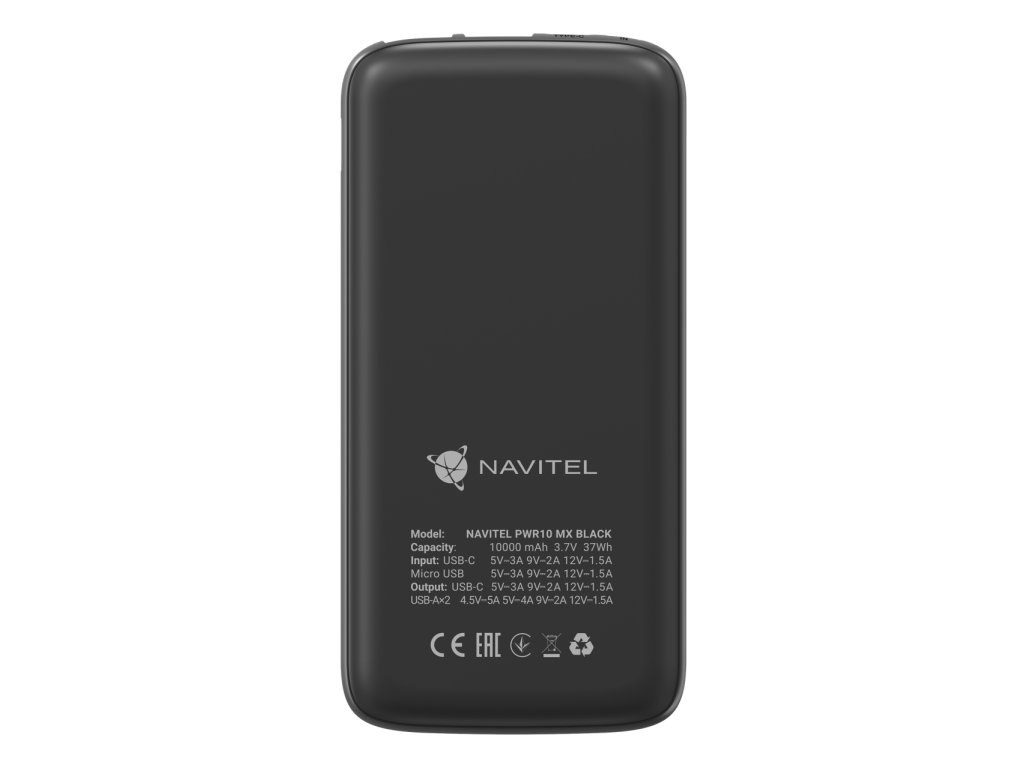 NAVITEL PWR10 MX BLACK monitoruje výkon a kapacitu baterie připojených zařízení, nezávisle rozděluje tok energie a zajišťuje rovnoměrné nabíjení a ochranu nabíjených zařízení před přetížením. Tělo přístroje je vyrobeno z odolného plastu. Jeho povrch je odolný proti poškrábání a oděru. Díky kompaktní velikosti 140x69x15.5 mm a nízké hmotnosti 220 gramů se externí baterie snadno vejde do kapsy batohu nebo tašky. Přenosná baterie PWR10 MX BLACK bude věrným pomocníkem na výletě, na pikniku v přírodě atd.