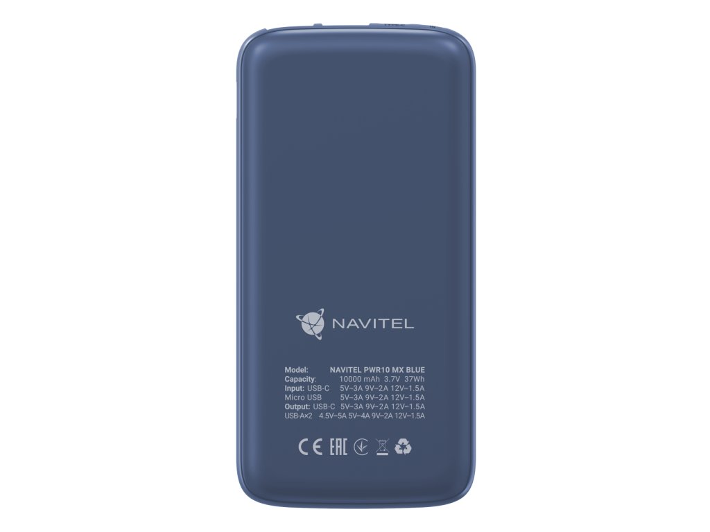 NAVITEL PWR10 MX BLUE monitoruje výkon a kapacitu baterie připojených zařízení, nezávisle rozděluje tok energie a zajišťuje rovnoměrné nabíjení a ochranu nabíjených zařízení před přetížením. Tělo přístroje je vyrobeno z odolného plastu. Jeho povrch je odolný proti poškrábání a oděru. Díky kompaktní velikosti 140x69x15.5 mm a nízké hmotnosti 220 gramů se externí baterie snadno vejde do kapsy batohu nebo tašky. Přenosná baterie PWR20 MX BLUE bude věrným pomocníkem na výletě, na pikniku v přírodě atd.