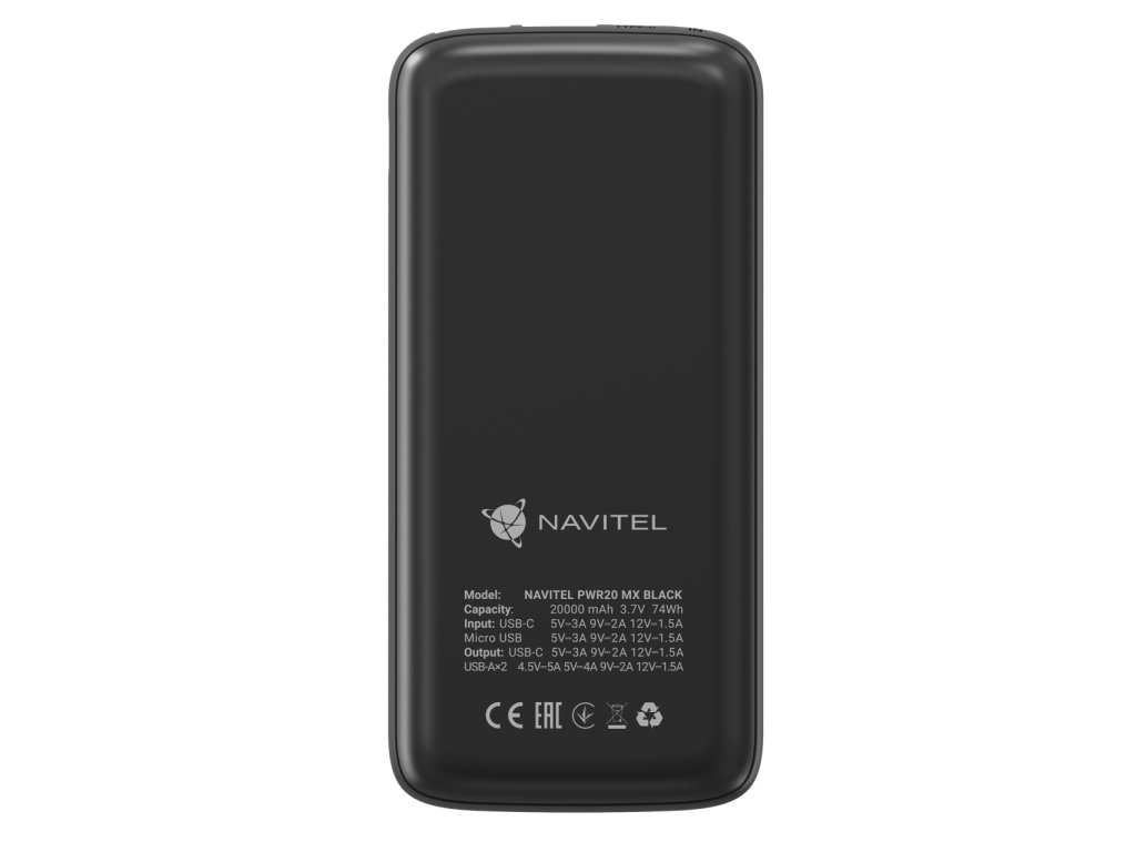 NAVITEL PWR20 MX BLACK monitoruje výkon a kapacitu baterie připojených zařízení, nezávisle rozděluje tok energie a zajišťuje rovnoměrné nabíjení a ochranu nabíjených zařízení před přetížením. Tělo přístroje je vyrobeno z odolného plastu. Jeho povrch je odolný proti poškrábání a oděru. Díky kompaktní velikosti 145x69x28 mm a nízké hmotnosti 400 gramů se externí baterie snadno vejde do kapsy batohu nebo tašky. Přenosná baterie PWR20 MX BLACK bude věrným pomocníkem na výletě, na pikniku v přírodě atd.