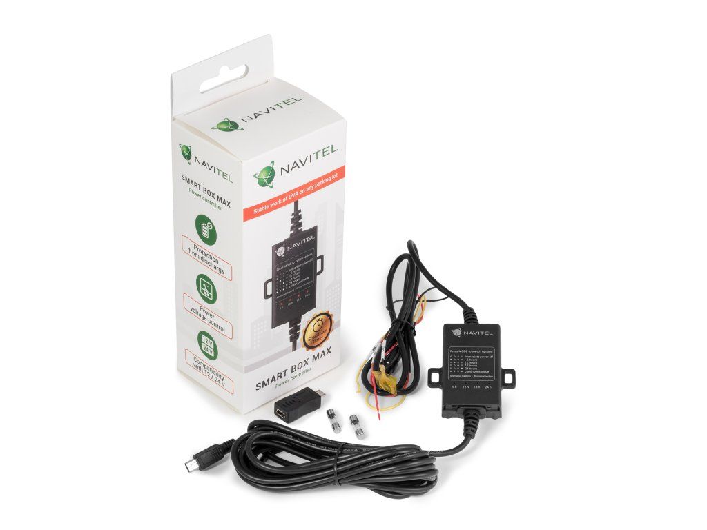 NAVITEL SMART BOX MAX chrání baterii vozidla před vybitím na základě napětí nebo přednastaveného času. Regulátor výkonu automaticky vypne napájení kamery, když napětí baterie v autě klesne pod stanovenou hodnotu nebo uplyne nakonfigurovaný čas (podle toho, co nastane dříve). NAVITEL SMART BOX MAX také chrání Vaši autokameru před přepětím.