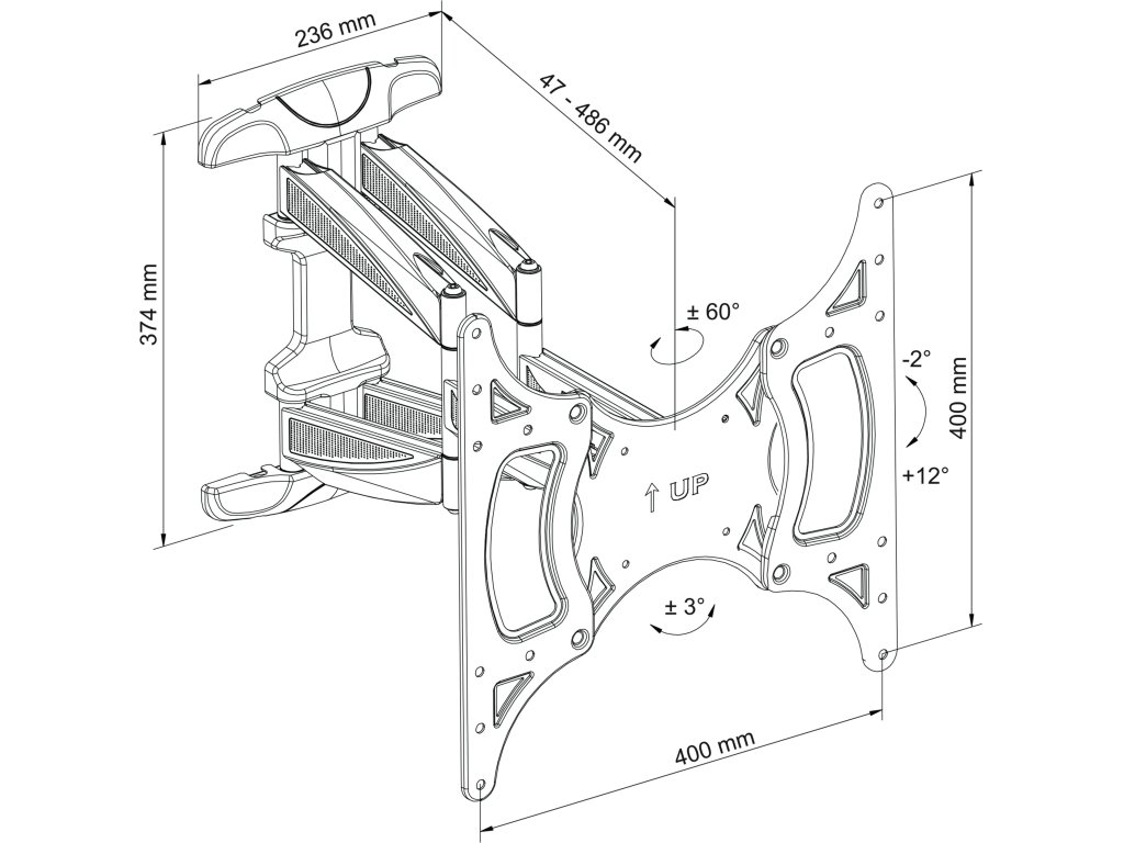 Dvojitá kloubová ramena nabízejí nejvyšší možnou stabilitu s maximální vzdáleností od stěny 486 mm. Velký rozsah otáčení tohoto nástěnného držáku je až ± 60° (v závislosti na velikosti zařízení). Nastavitelný sklon obrazovky od -2° do 12° umožňuje také optimalizaci úhlu pohledu na obraz.